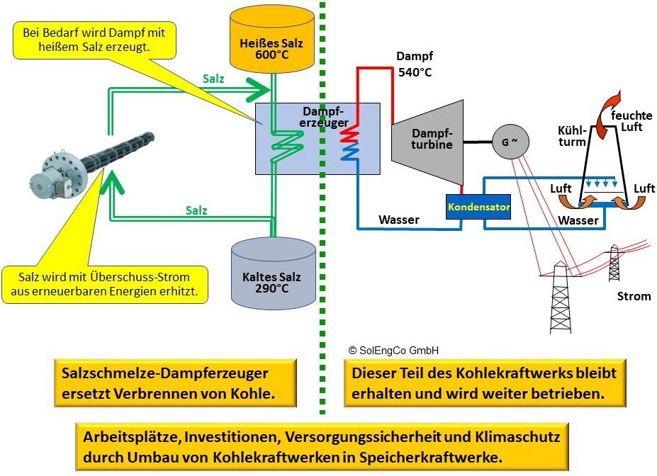 SolEngCo hat die Erfahrung und die Referenzen mit Salzschmelze-Energiespeichern und kann Betreiber von Kohlekraftwerken unterstützen, Arbeitsplätze, Investitionen und Sicherung der Stromversorgung zu erhalten und das Klima zu schützen.